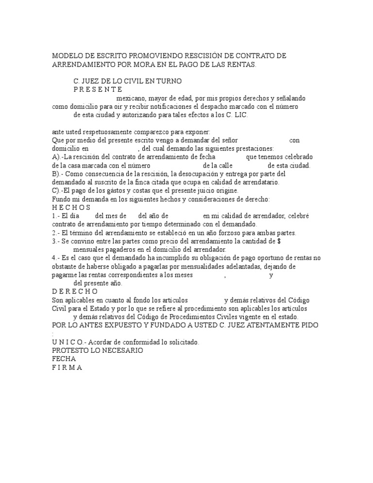Modelo De Escrito Promoviendo Rescision De Contrato De Arrend Alquiler Informacion Del Gobierno