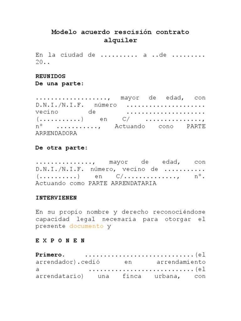 Modelo de recision de contrato de alquiler. Si piensas alquilar o poner tu propiedad en el mercado te ofrecemos unos contratos modelos para que puedas tener la informacin que necesitas actualizados para 2021. Motivo por el que se produce la rescisin del contrato. Los contratos de arrendamiento son el medio para establecer una relacin entre un sujeto llamado arrendador y otro llamado arrendatario.