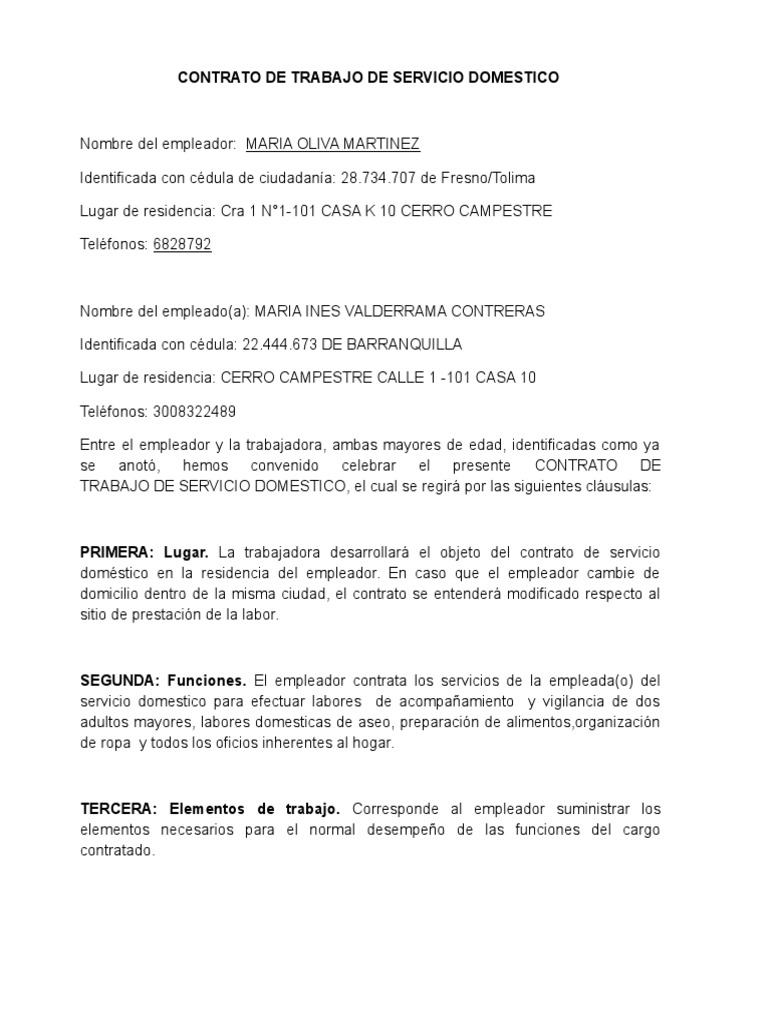 Modelo De Contrato De Trabajo Para Empleada Del Hogar