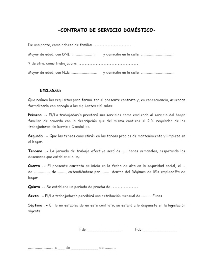 Modelo contrato empleada de hogar temporal. El contrato podr celebrarse por tiempo indefinido o por una duracin determinada en los casos legalmente previstos. Todas aquellas actividades comprendidas en el rea de las tareas domsticas as como tareas de cuidado o atencin de los miembros de la familia o tareas de guardera o.