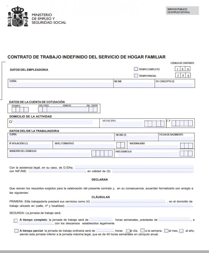 Conforme a la Ley es obligatorio formalizar un contratoEn caso contrario estaramos incurriendo en una infraccin que puede. Servicio pblico de empleo estatal ministerio de empleo y seguridad social contrato de trabajo indefinido del servicio de hogar familiar cdigo de contrato datos del empleadora tiempo completo 1 0 0 tiempo parcial 2 0 0 dda. El contrato del servicio del hogar familiar est dirigido a todos aquellos que deseen o necesiten formalizar la contratacin de un empleado del hogar o domstico es decir personal que realizar tareas como.